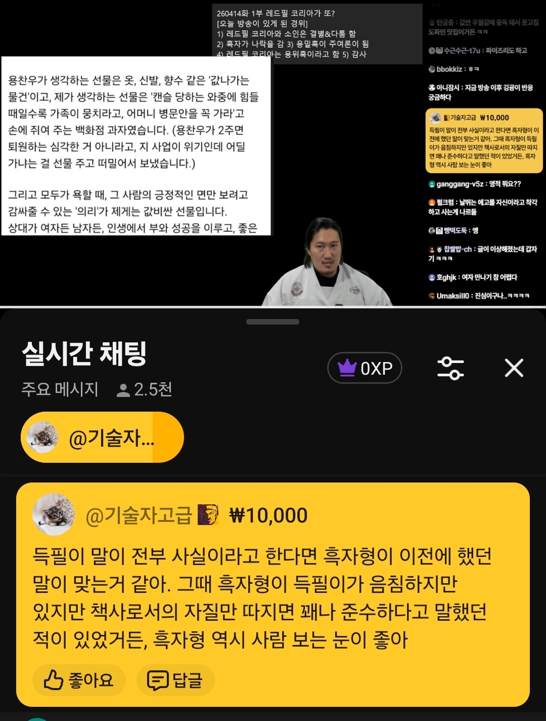 흑자: 드필이와 저는 짜치는계열에 인간이고 용찬우는 거짓말하는 사람이죠. 드필이와 전 약속을 해놓고 못지키는..그런부류에 가깝죠