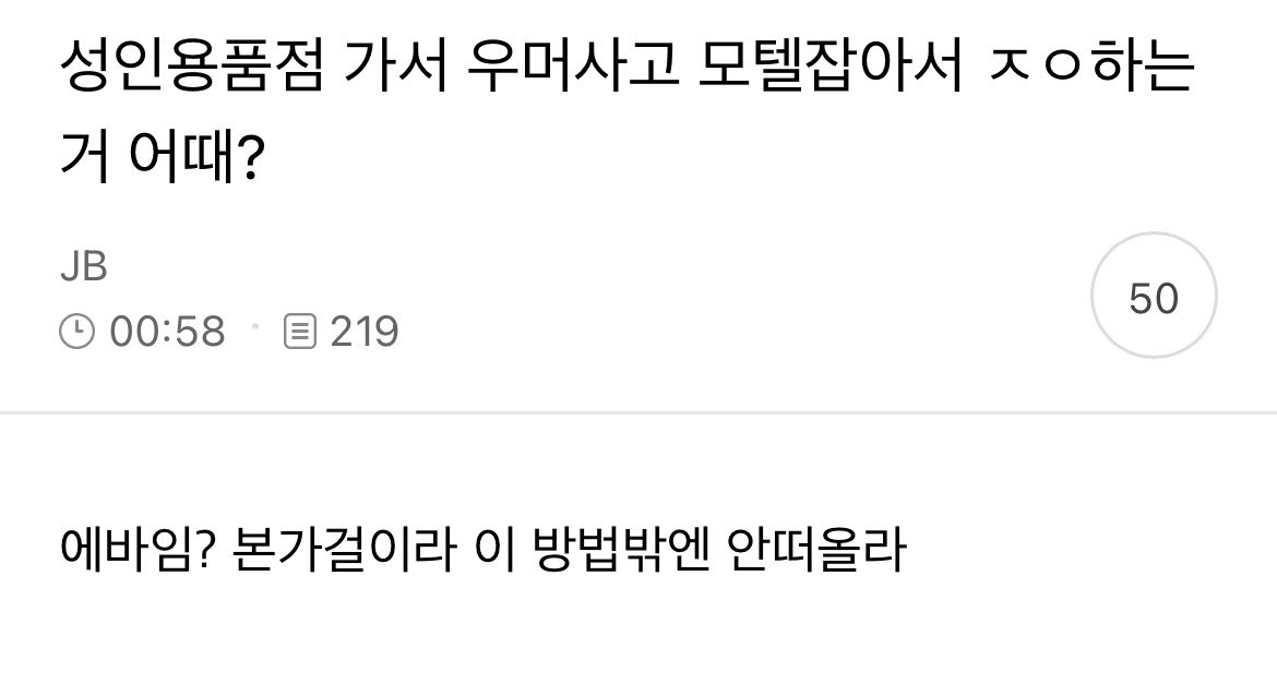 성인용품점 가서 우머사고 모털잡아서 ㅈㅇ하는거 어때? 지민 · 2026-04-26 22:02 · 조회 39 공유 카카오톡 페이스북 X 링크 복사 여시 첨부파일 📎 f2bc54b1c0db8101f75b7298e80a249c.jpg (106 KB · 다운로드 1) 2 1 다음글 페미인데 남미새일 수 있어? 이전글 이태원의 그녀, 소시오패스 꼬막눈의 이야기 읽어주십시요ㅠㅠ 댓글 4 🔥 HOT 댓글 HOT 김규언흑자지땅기견 2시간 전 3 새우야 모든 댓글 닉네임 JB인건 디시유동처럼 ㅇㅇ 인거고 작성자 라고 되잇는것만 글쓴사람이야 자... HOT 새우땅기견 2시간 전 3 아 ㄹㅇ요? 너무 충격적이라 자문자답짤인줄...다시보니 작성자 표시가 있네요 ㄱㅅㄱㅅ HOT 아가규땅기견 2시간 전 1 JB면 쭉빵인데 저기도 여초지? 신기하다..여자도 저정도로 성욕이 세구나 HOT 아가규땅기견 2시간 전 JB면 쭉빵인데 저기도 여초지? 신기하다..여자도 저정도로 성욕이 세구나 더보기 답글 1 0 답글 3개 답글 숨기기 ↳ 새우땅기견 2시간 전 아니 근데 저거 주작이잖아 모든 댓글이 본인이고 자문자답이네 더보기 답글 1 0 ↳ HOT 김규언흑자지땅기견 2시간 전 @새우 새우야 모든 댓글 닉네임 JB인건 디시유동처럼 ㅇㅇ 인거고 작성자 라고 되잇는것만 글쓴사람이야 자문자답이아님 더보기 답글 3 0 ↳ HOT 새우땅기견 2시간 전 @김규언흑자지 아 ㄹㅇ요? 너무 충격적이라 자문자답짤인줄...다시보니 작성자 표시가 있네요 ㄱㅅㄱㅅ 더보기 답글 3 0 님에게 답글 작성 중 취소 비밀 댓글 작성