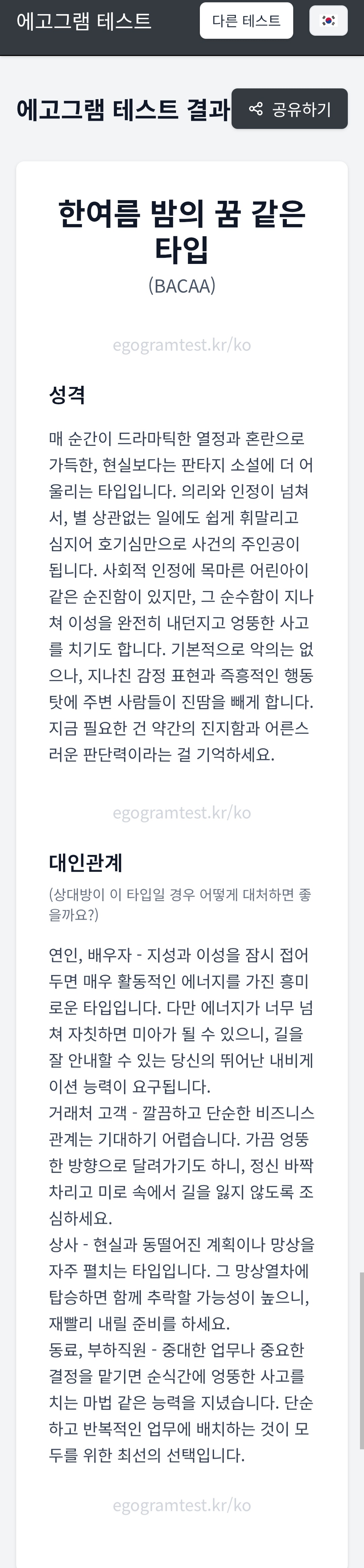 자유 에고그램 BACAA 나온사람 있어? 땅카리겐도땅기견 · 2026-04-27 03:19 · 조회 16 공유 카카오톡 페이스북 X 링크 복사 아니...땅이가 유머 게시판에 올린 거 해봤는데내용 충격적이어서 다시 했는데 두 번 다 이거 나옴내용 너무 트롤인데 (...) 맞는 거 같음 첨부파일 📎 614b0b74ee151df9d0bb247b6c266ce6.jpg (725 KB · 다운로드 0) 2 0 다음글 땅이가 공유해준 에고그램 테스트 결과 이전글 땅컴퍼니 야유회 롤 대회 내전 20인 결과 댓글 6 🔥 HOT 댓글 HOT 다이어그램땅기견 2시간 전 1 난 무슨 "끝없이 충전된 배터리로 달리는 어린이집 에이스 타입" 나오는데 ㅋㅋㅋㅋㅋㅋㅋ 근데 결과가 ... HOT 땅카리겐도땅기견 2시간 전 1 보여줘!! 다들 이성적인 결과 나오는거 같은데 나는 INFP라서 ㅋ🥹 HOT 노미희 2시간 전 1 아가규로 돌아와... HOT 다이어그램땅기견 2시간 전 난 무슨 "끝없이 충전된 배터리로 달리는 어린이집 에이스 타입" 나오는데 ㅋㅋㅋㅋㅋㅋㅋ 근데 결과가 기본적으로 좋은 어투는 아닌듯? 나도 별로야. 더보기 답글 1 0 답글 1개 답글 숨기기 작성자 ↳ HOT 땅카리겐도땅기견 2시간 전 보여줘!! 다들 이성적인 결과 나오는거 같은데 나는 INFP라서 ㅋ🥹 더보기 답글 1 0 HOT 노미희 2시간 전 아가규로 돌아와... 더보기 답글 1 0 답글 1개 답글 숨기기 작성자 ↳ 땅카리겐도땅기견 2시간 전 Gpt가 잘 그려줘서 간지나고 싶어서 바꿔봤는데 안그래도 오바한거 같아서 후회중 한 달 기다려야 함! 🤣🤣 더보기 답글 1 0 땅튜브대장님 2시간 전 ㅈㄴ 피곤하게 만드는 스타일 아니야?..... 더보기 답글 1 0 답글 1개 답글 숨기기 작성자 ↳ 땅카리겐도땅기견 2시간 전 땅이다 헉헉🤤 더보기 답글 0 0 님에게 답글 작성 중 취소 비밀 댓글 작성