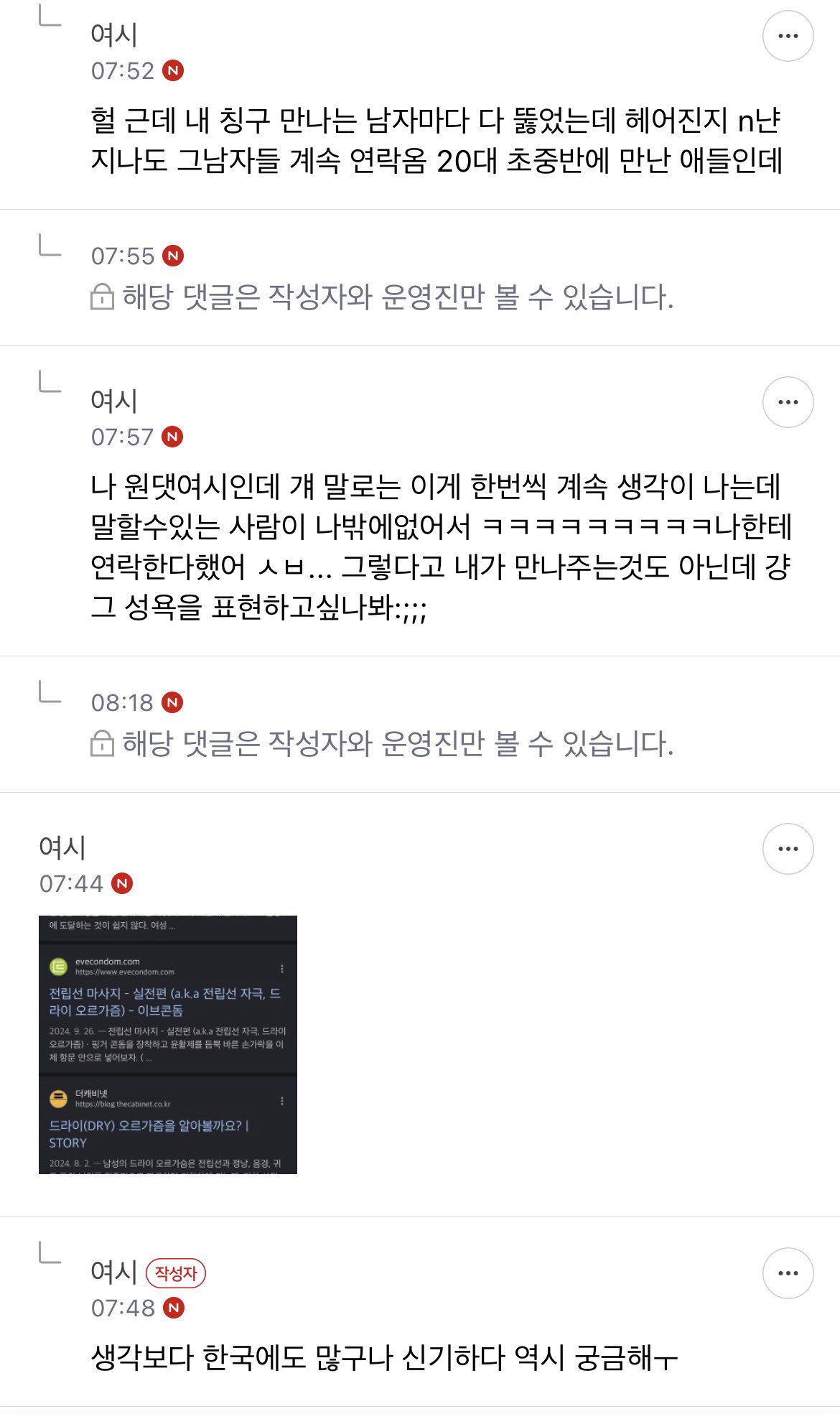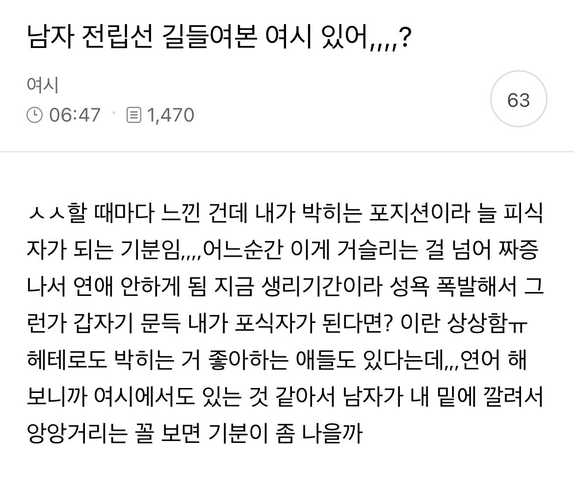 남자 전립선 길들여본 여시 있어? 지민 · 2026-04-27 07:15 · 조회 51 공유 카카오톡 페이스북 X 링크 복사 여시 첨부파일 📎 2034ca98c7ae8a65307a259c90e24f0c.jpg (31 KB · 다운로드 1) 0 3 다음글 내 에고그램 껍데기인간 그자체네 이전글 에고그램 결과 시발거 댓글 2 🔥 HOT 댓글 HOT 노미희 2시간 전 1 너도 에고그램 테스트 한 번 해봐 HOT 노미희 2시간 전 너도 에고그램 테스트 한 번 해봐 더보기 답글 1 0 NAGUHA…형님 51분 전 구멍 달고 태어났음 박혀야지 ㅋㅋ 더보기 답글 0 0 님에게 답글 작성 중 취소 비밀 댓글 작성
