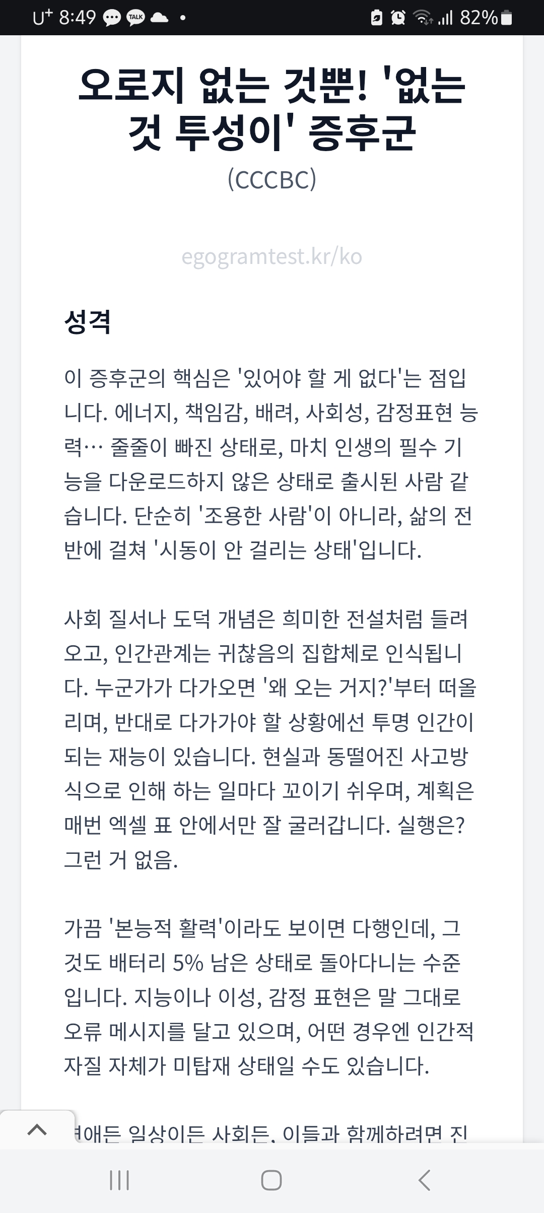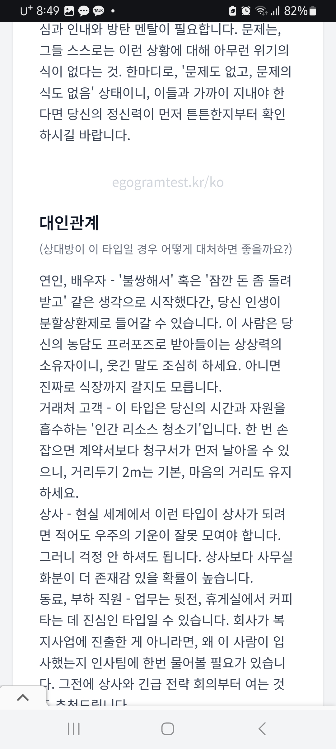 자유 에고그램 백여화땅기견 · 2026-04-27 08:51 · 조회 34 공유 카카오톡 페이스북 X 링크 복사 뭔가 생각한 것과는 좀 다르네 ㅋㅋ 맞는 것 같기도 하고.. 첨부파일 📎 a46a9643dd9cf338156441ccae8f2ccd.jpg (733 KB · 다운로드 1) 2 1 다음글 어흐18 이전글 에고그램 재봤는데 댓글 10 🔥 HOT 댓글 HOT 윤미래 2시간 전 2 sex HOT 노미희 2시간 전 2 와... 결과만 봤는데도 기운이 쑥 빠지네... 어느정도 동의함? HOT 백여화땅기견 2시간 전 2 대인 관련 부분은 동의 안 하는데, 성격은 동의함 ㅋㅋ 겉으로는 안 그러는데 속은 저래요 HOT 윤미래 2시간 전 sex 더보기 답글 2 0 답글 2개 답글 숨기기 작성자 ↳ 백여화땅기견 2시간 전 ㅋㅋ 더보기 답글 0 0 ↳ 땅카리겐도땅기견 2시간 전 미래야, 너도 해봐 더보기 답글 0 0 HOT 노미희 2시간 전 와... 결과만 봤는데도 기운이 쑥 빠지네... 어느정도 동의함? 더보기 답글 2 0 답글 2개 답글 숨기기 작성자 ↳ HOT 백여화땅기견 2시간 전 대인 관련 부분은 동의 안 하는데, 성격은 동의함 ㅋㅋ 겉으로는 안 그러는데 속은 저래요 더보기 답글 2 0 ↳ 노미희 2시간 전 @백여화 사회화의 승리 느낌 ㅋㅋㅋ 더보기 답글 2 0 땅카리겐도땅기견 2시간 전 실례지만 .. 누님도 INFP인가요...? 더보기 답글 1 0 답글 1개 답글 숨기기 작성자 ↳ 백여화땅기견 2시간 전 ㅋㅋㅋㅋ 아니요 intp 입니다 동생이 infp임 ㅋㅋ 더보기 답글 1 0 산 산과들 211.234.*.* 2시간 전 화이팅! 더보기 답글 2 0 엔젤형님 2시간 전 시동만걸리면 부릉부릉 더보기 답글 2 0 님에게 답글 작성 중 취소 비밀 댓글 작성
