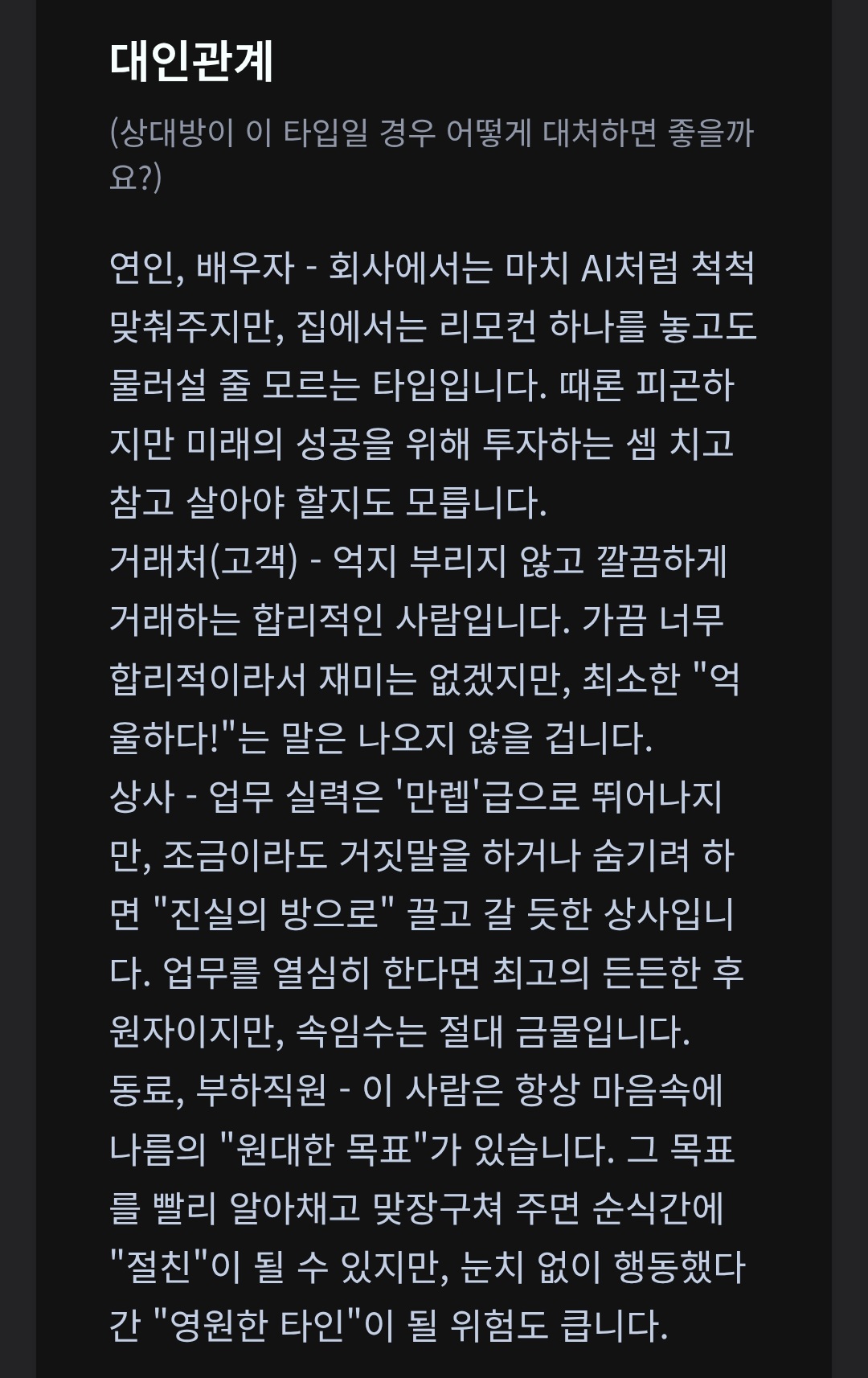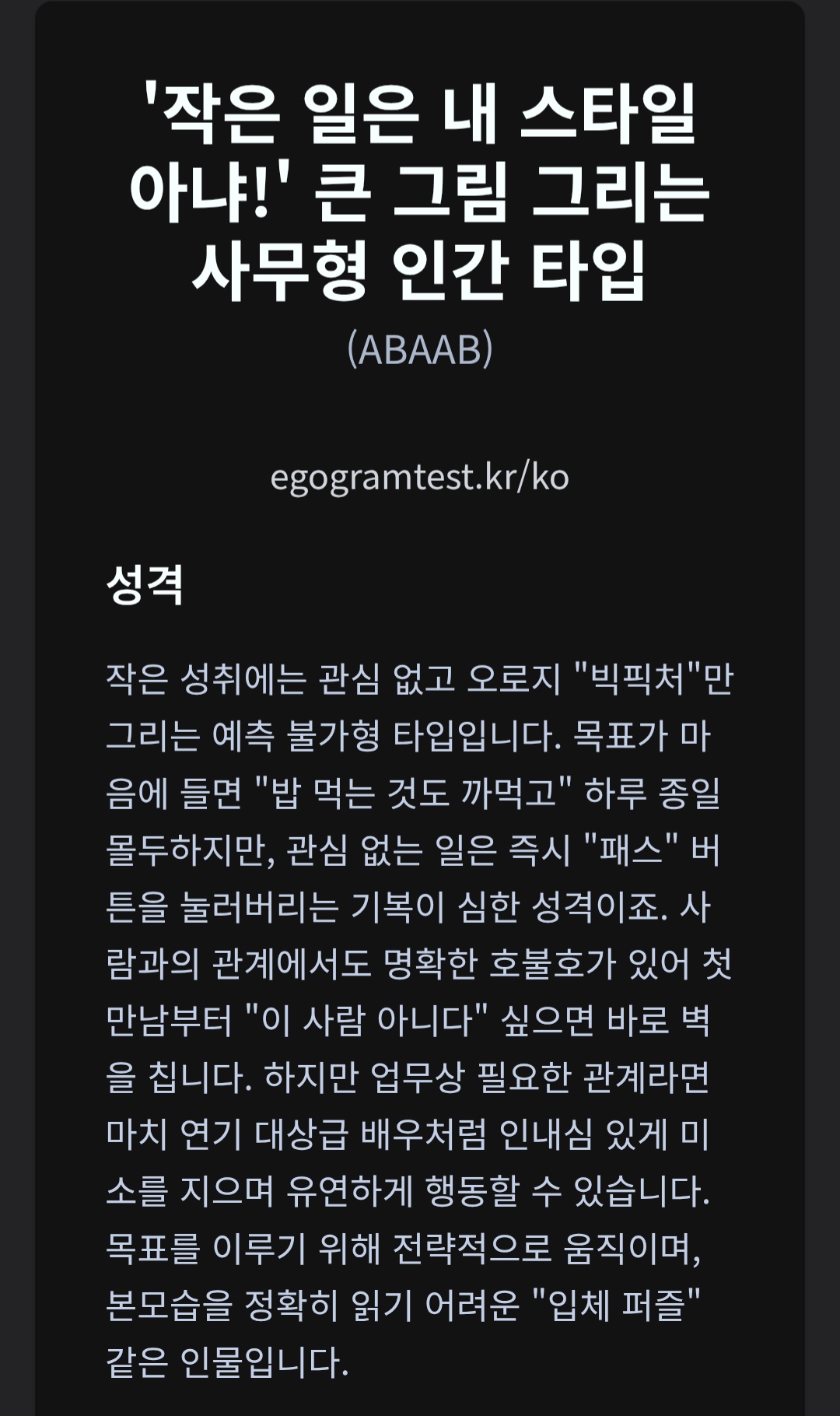 자유 에고그램... 퍼센티지는 어디서봄 Westbr…땅기견 · 2026-04-27 19:35 · 조회 38 공유 카카오톡 페이스북 X 링크 복사 이건 이렇게 나옴.. 첨부파일 📎 c4ee2aecabf715e94f50292691740d3c.jpg (368 KB · 다운로드 1) 2 0 다음글 애착유형 링크를 달아야 사람들이 같이하지 이전글 나도 테스트 댓글 9 🔥 HOT 댓글 HOT Westbr…땅기견 1일 전 3 그냥 개에바로 나왔네.... HOT 노미희 1일 전 2 그런데 왜 코메에게 그렇게 냉정히 선을 긋지 못했던... 다른 테스트는 유머에 올려놨어요 HOT 묵공대사땅기견 1일 전 2 맞는거 같은데?코매랑 토론하는거 보면 작성자 HOT Westbr…땅기견 1일 전 그냥 개에바로 나왔네.... 더보기 답글 3 0 HOT 노미희 1일 전 그런데 왜 코메에게 그렇게 냉정히 선을 긋지 못했던... 다른 테스트는 유머에 올려놨어요 더보기 답글 2 0 답글 1개 답글 숨기기 작성자 ↳ Westbr…땅기견 1일 전 감사함당 더보기 답글 1 0 HOT 묵공대사땅기견 1일 전 맞는거 같은데?코매랑 토론하는거 보면 더보기 답글 2 0 답글 1개 답글 숨기기 작성자 ↳ Westbr…땅기견 1일 전 그렇게 보일수도있군요 더보기 답글 1 0 땅튜브대장님 1일 전 잘 어울리노 더보기 답글 1 0 답글 1개 답글 숨기기 작성자 ↳ Westbr…땅기견 1일 전 ㄱㅅㄱㅅㄱㅅㄱㅅ 더보기 답글 1 0 땅카리겐도땅기견 1일 전 글만 보면 모르겠는데 운동 쇼츠 💪 보니까 원대한 목표, 큰그림 ,근성 느껴짐!! 더보기 답글 1 0 답글 1개 답글 숨기기 작성자 ↳ Westbr…땅기견 1일 전 ㅋㅋㅋ 그냥 살빼야하는 돼지임.. 더보기 답글 0 0 님에게 답글 작성 중 취소 비밀 댓글 작성