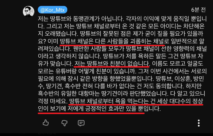 * **땅튜브와의 관계 단절:** 땅튜브와는 친분이나 동맹 관계가 전혀 없으며, 오로지 각자의 이익과 필요에 따라 일시적으로 같은 방향을 향했을 뿐입니다.