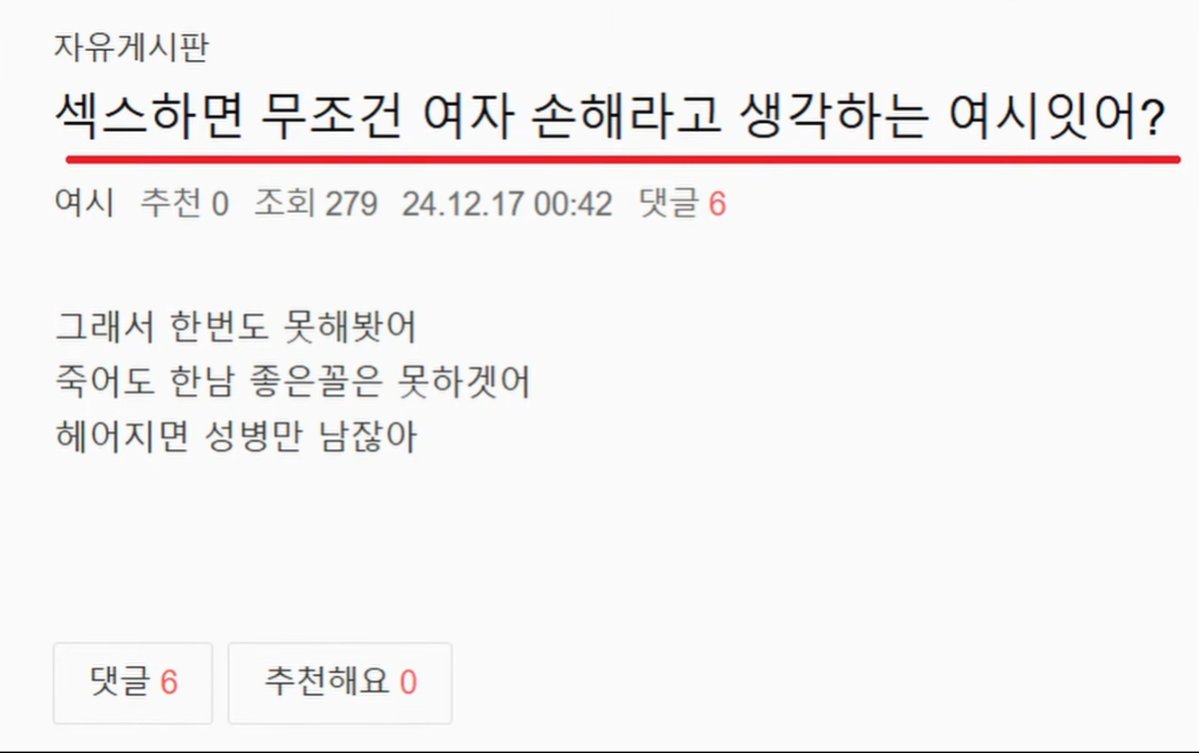섹스하면 무조건 여자 손해라고 생각하는 여시잇어? 지민 · 2026-03-31 16:30 · 조회 33 공유 카카오톡 페이스북 X 링크 복사 여시 첨부파일 📎 1000016768.png (224 KB · 다운로드 0) 2 0 다음글 어흐2 이전글 데이트비용 10:0 안하는 남자특 댓글 0 첫 댓글을 남겨보세요. 님에게 답글 작성 중 취소 비밀 댓글 작성