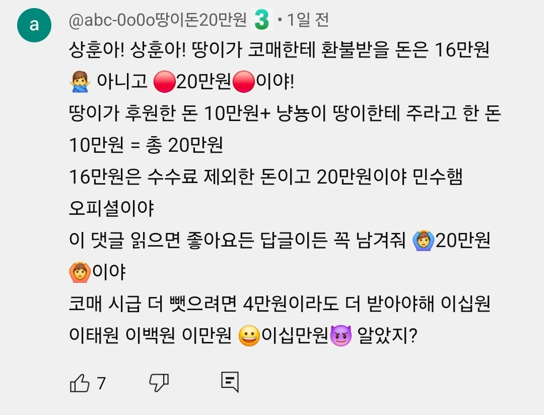 "16만원 아니고 20만원임"이 채팅을 계속 쳤어