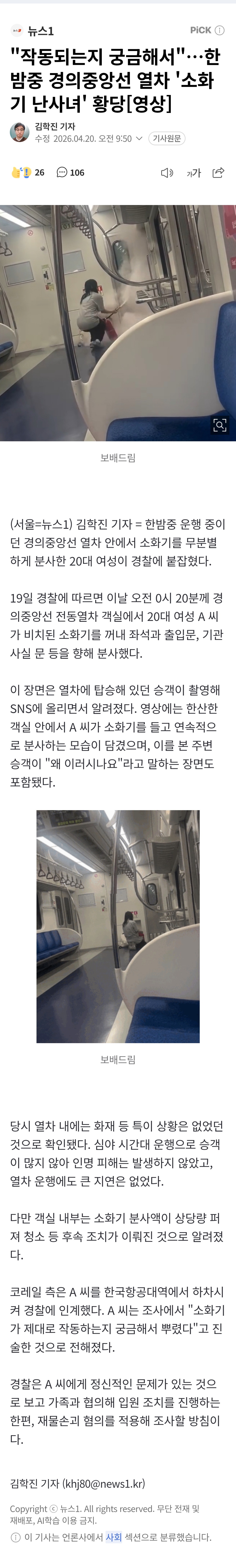 작동되는지 궁금해서"…한밤중 경의중앙선 열차 '소화기 난사녀