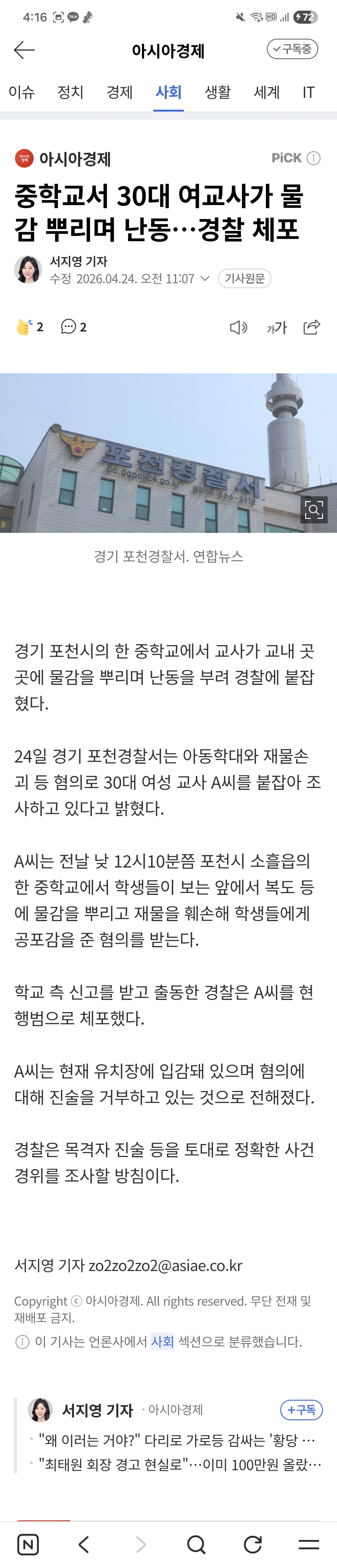 중학교서 30대 여교사가 물감 뿌리며 난동…경찰 체포